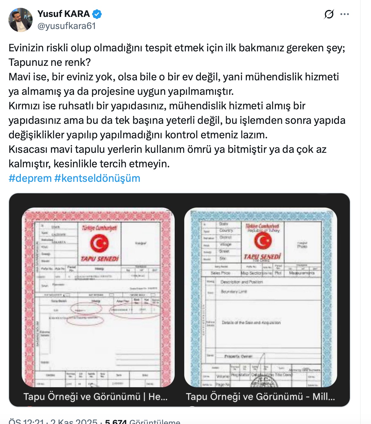 Yusuf Kara; '' Evinizin riskli olup olmadığını tespit etmek için ilk bakmanız gereken şey; Tapunuz ne renk? Mavi ise, bir eviniz yok, olsa bile o bir ev değil, yani mühendislik hizmeti ya almamış ya da projesine uygun yapılmamıştır. Kırmızı ise ruhsatlı bir yapıdasınız, mühendislik hizmeti almış bir yapıdasınız ama bu da tek başına yeterli değil, bu işlemden sonra yapıda değişiklikler yapılıp yapılmadığını kontrol etmeniz lazım. Kısacası mavi tapulu yerlerin kullanım ömrü ya bitmiştir ya da çok az kalmıştır, kesinlikle tercih etmeyin.''
