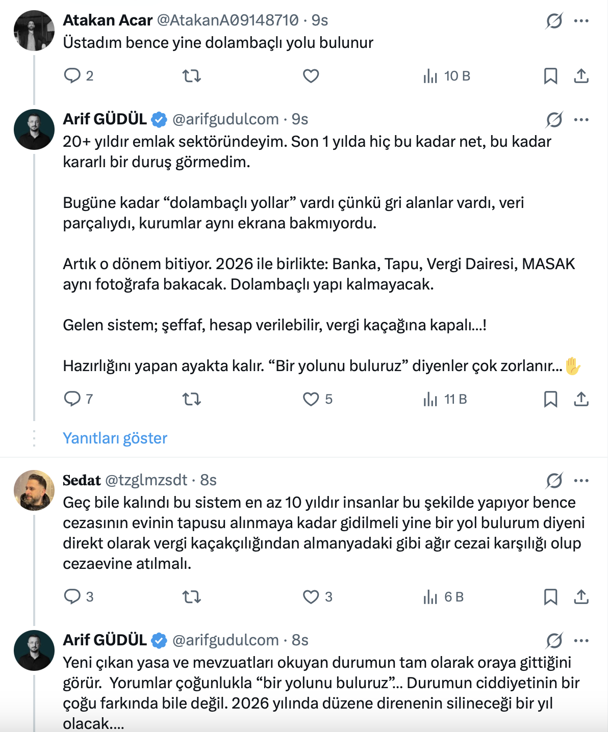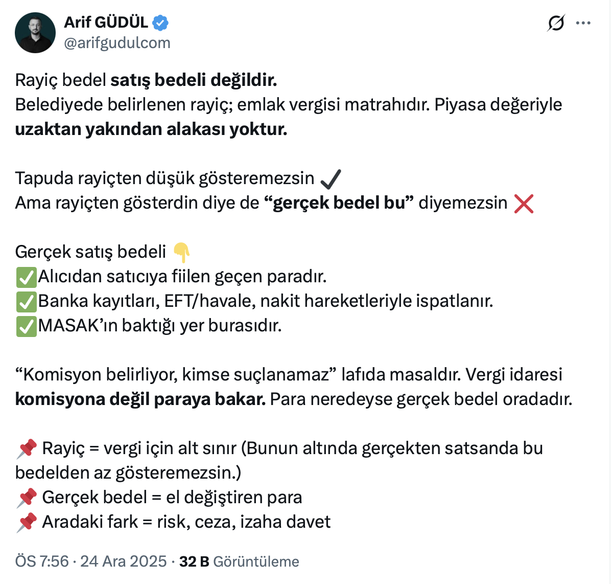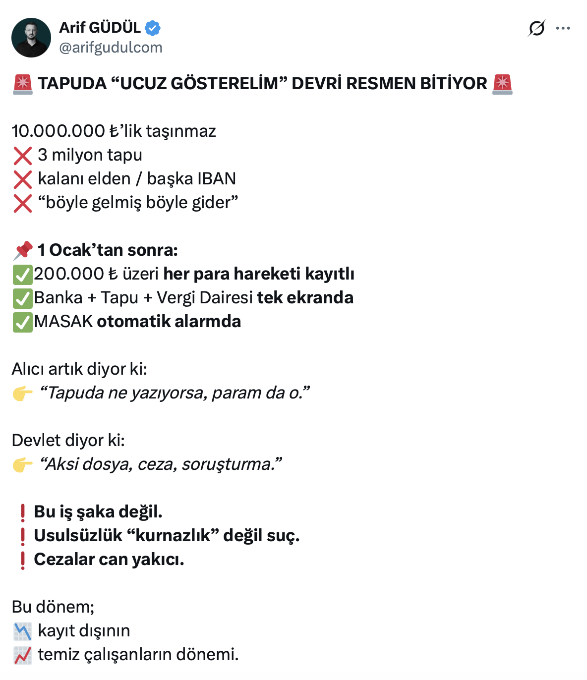 Güdül yaptığı paylaşımda tapuda ucuz gösterelim devrinin resmen bittiğini belirtti.