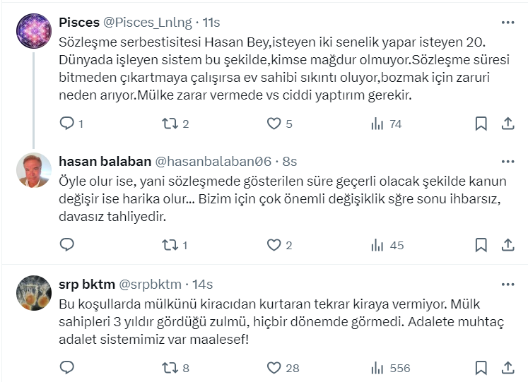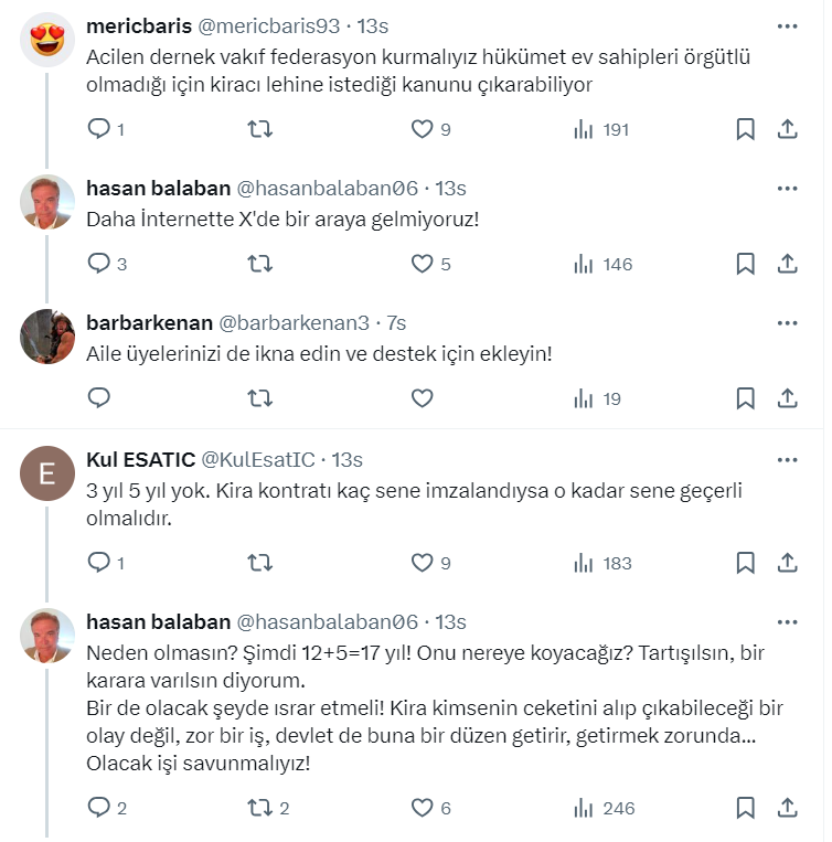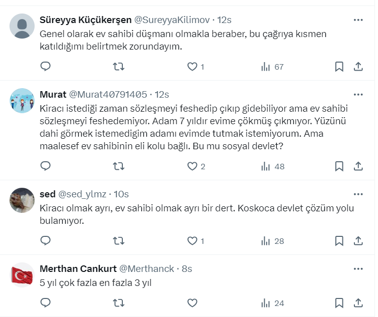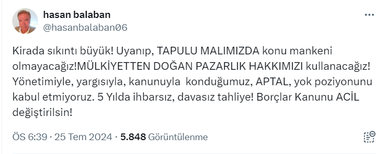 Mağdur ev sahibi Hasan Balaban sosyal medya hesabı https://x.com/hasanbalaban06 üzerinden yaptığı paylaşımda "Tapulu malımızda konu mankeni olmayacağız" diyerek, "Borçlar Kanunu acil değiştirilsin" çağrısı yaptı.