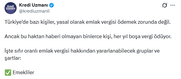 Kredi Uzmanı, sosyal medya hesabından emlak vergisinden muaf olanları tek tek açıkladı ve tapu sahiplerini uyardı.