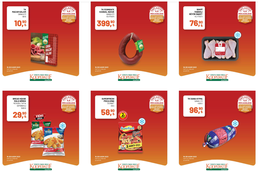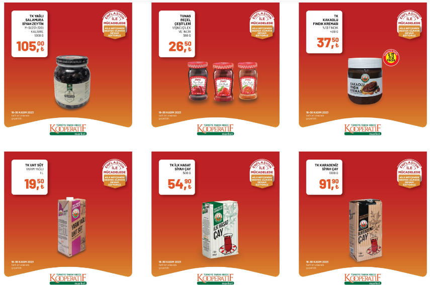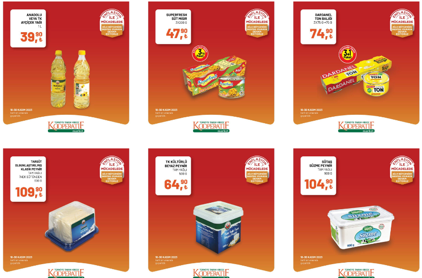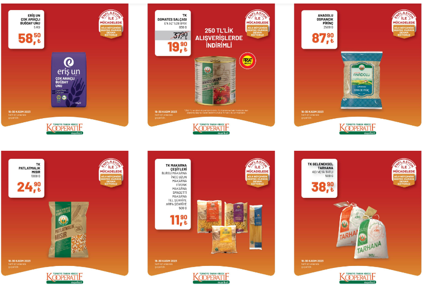 Tarım Kredi 20-30 Kasım indirim kataloğunda; Salça 19,90 TL, dana kıyma 96,90 TL, ayçiçek yağ 39,90 TL'ye düştü!