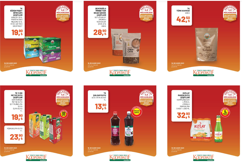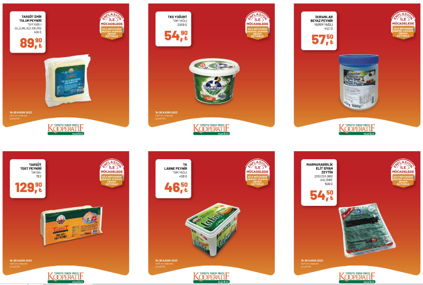 30 Kasım 2023 tarihine kadar geçerli olan indirimli ürünler arasında Sıvı Deterjan 74,90 lira, Tost peyniri 129,90 lira, Domates Salçası 19,90 lira, Dana Kıyma 96,90 TL, 40'lı Tuvalet Kağıdı 154,90 lira, ve Makarna Çeşitleri 11,90 lira gibi birbirinden avantajlı fiyatlarla yerini aldı.