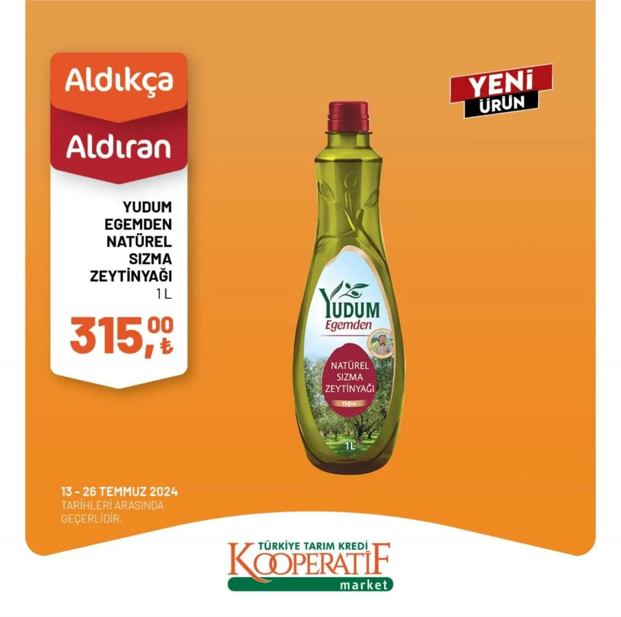 Tarım Kredi Kooperatif Market 13-26 Temmuz 2024 güncel indirimli ürünlerini paylaştı. Yudum Egemden Natürel Sızma Zeytinyağı 1 L 315 Türk Lirası,