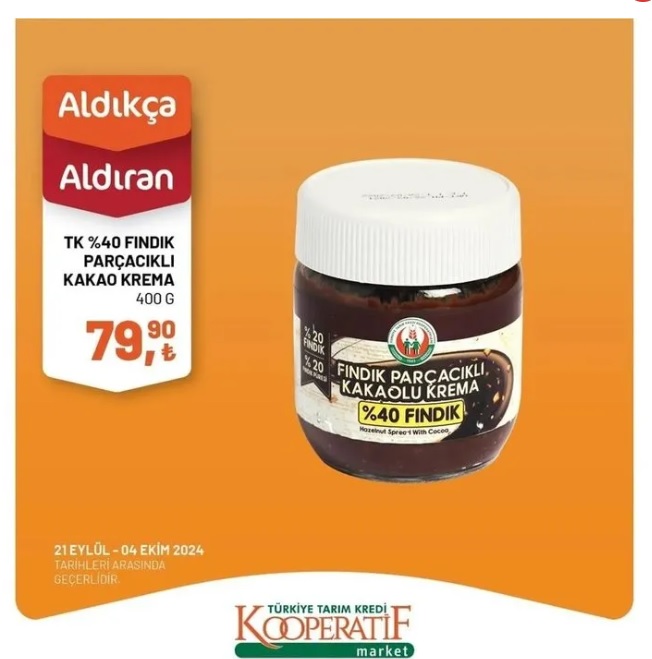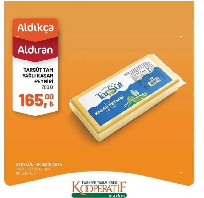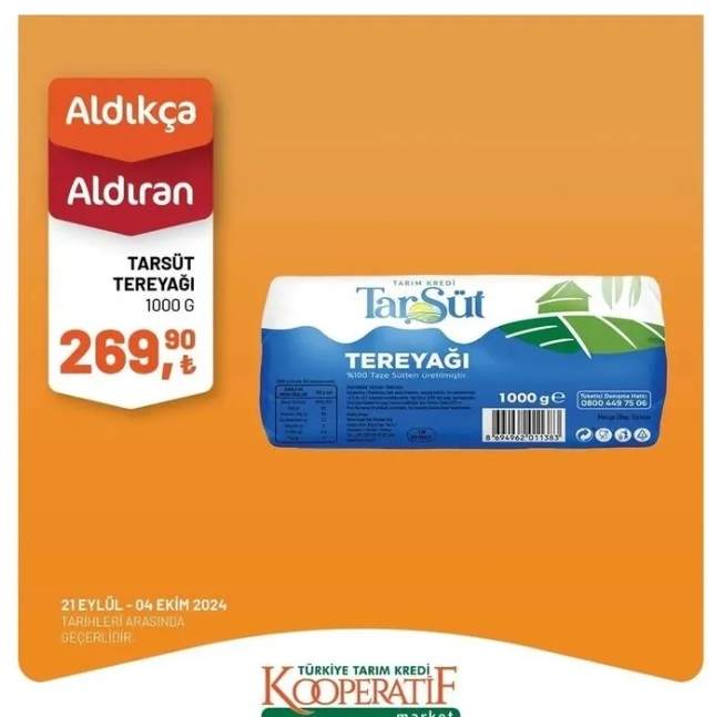 Tarım Kredi Kooperatif Marketleri, 4 Ekim'e kadar sürecek tereyağı indirimini de duyurdu. 1 kg Tarsus tereyağı, indirimli olarak 269,90 TL'ye satılıyor. Stoklarla sınırlı olan bu ürünler raflarda yerini alıyor.