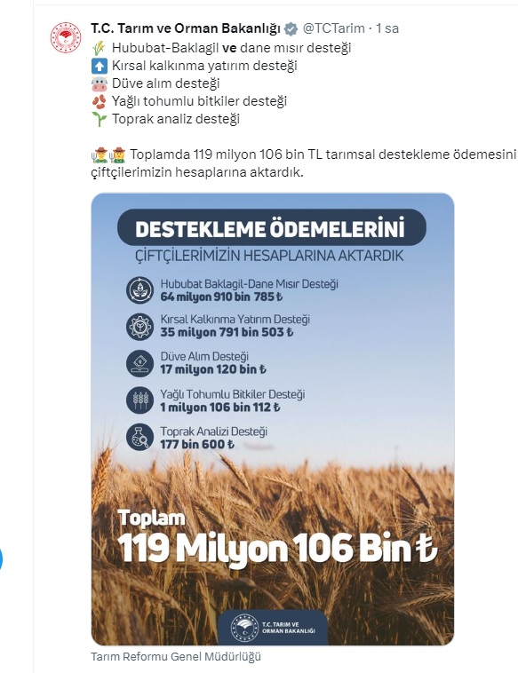 Tarım ve Orman Bakanlığının sosyal medya hesabı X üzerinden konu ile ilgili olarak yaptığı paylaşım kapsamında, 119 milyon 106 bin liralık destekleme ödemesinin hesaplarına yatırıldığı belirtildi.