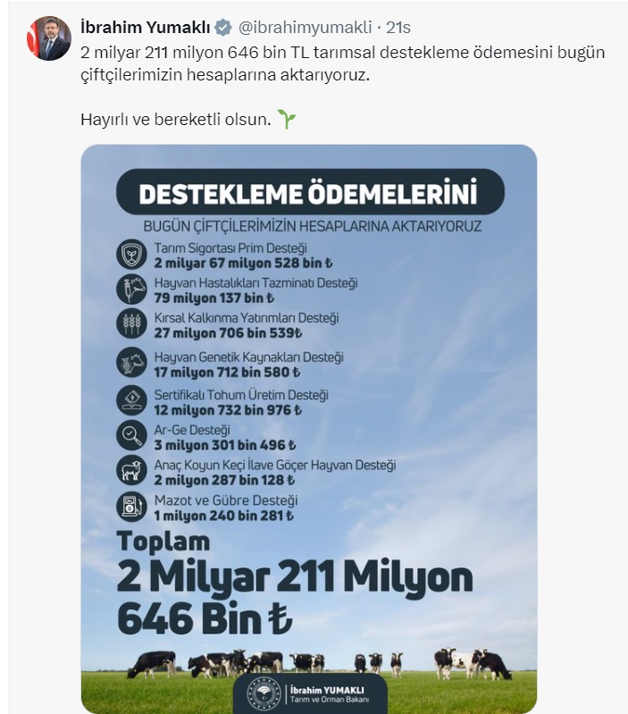 Destekleme ödemelerini bugün çiftçilerin hesaplarına aktaracaklarını bildiren Yumaklı, paylaşımında "2 milyar 211 milyon 646 bin lira tarımsal destekleme ödemesini bugün çiftçilerimizin hesaplarına aktarıyoruz. Hayırlı ve bereketli olsun." ifadesini kullandı.