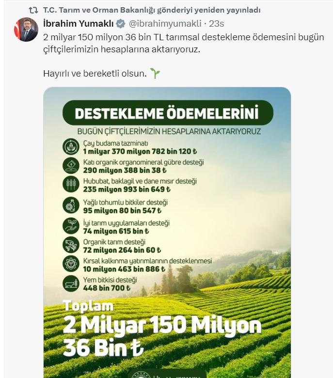 Tarım ve Orman Bakanı İbrahim Yumaklı , sosyal medya hesabı X üzerinden yaptığı açıklamada, 2 milyar 150 milyon 36 bin lira tarımsal destekleme ödemesini, bugün çiftçilerin hesaplarına aktardıklarını belirterek paylaşım yaptı.