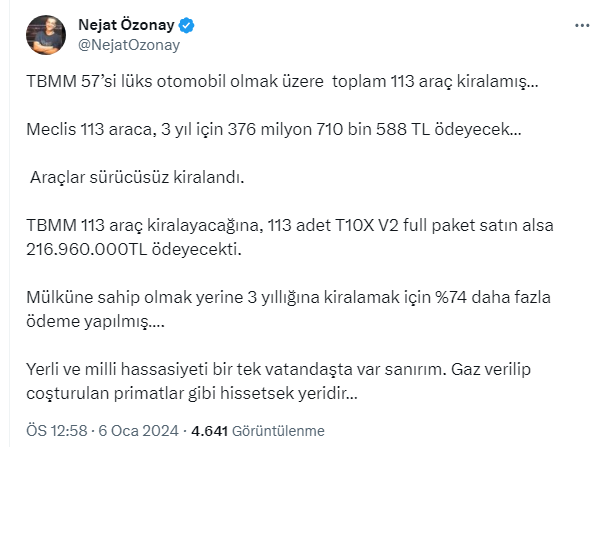 Ekonomist ve eski bankacı Nejat Özonay, sosyal medya hesabı X'ten TBMM'nin 3 yıl için kiraladığı araçların sayısını ve bu araçlara toplamda ne kadar verileceğini açıkladı. Özonay, TBMM'nin 57’si lüks otomobil olmak üzere toplam 113 araç kiraladığını ve bu araçlara toplamda 3 yıl için 376 milyon 710 bin 588 TL ödeyeceğini duyurdu. Bu açıklama gündeme bomba gibi düşerken vatandaşlardan sert yorumlar geldi. İşte o paylaşım ve gelen yorumlar...