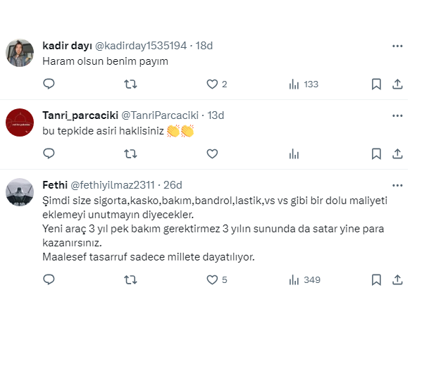 Fethi @fethiyilmaz2311: ''Şimdi size sigorta,kasko,bakım,bandrol,lastik,vs vs gibi bir dolu maliyeti eklemeyi unutmayın diyecekler. Yeni araç 3 yıl pek bakım gerektirmez 3 yılın sununda da satar yine para kazanırsınız.
