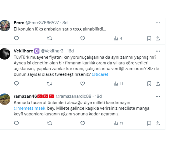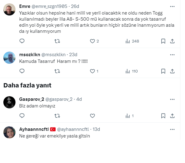 Emre @emre_szgn1905: ''Yazıklar olsun hepsine hani milli ve yerli olacaktık ne oldu neden Togg kullanılmadı beyler illa A8- S-500 mü kullanacak sonra da yok tasarruf edin yol öyle yok yerli ve milli artık bunların hiçbir sözüne inanmıyorum asla da ıy kullanmıyorum.'' dedi.