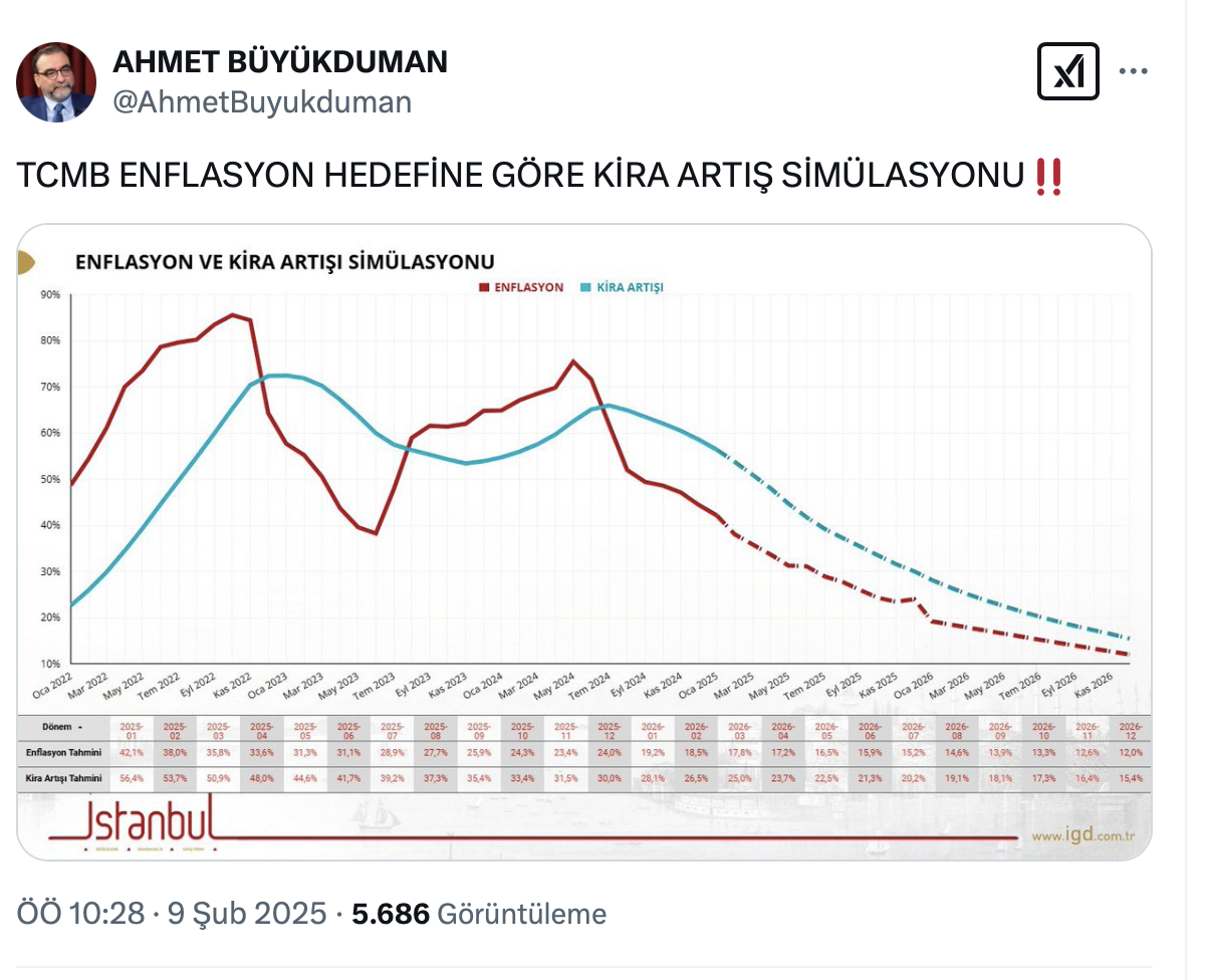 Ahmet Büyükduman resmi X hesabı https://x.com/AhmetBuyukduman üzerinden üzerinden TCMB enflasyon hedefine göre kira artış simülasyonunu paylaştı.
