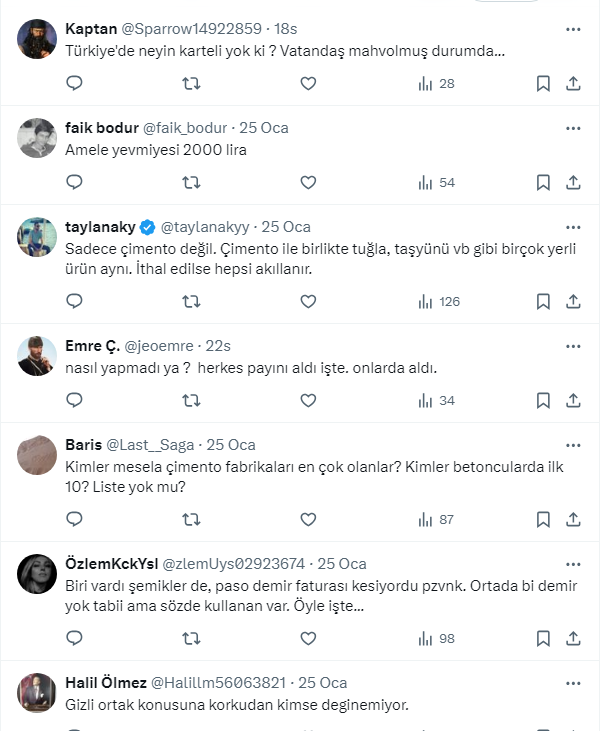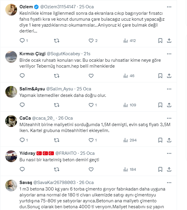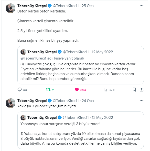 Sosyal medya hesabından hatırlatma yapan Tebernüş Kireçci, beton ve çimento fiyatlarını, kartellerin kafalarına göre belirlediğini, bunlarla baş edebilen kimsenin olmadığını söyleyerek 'bundan sonra olabilir mi, bunu hep beraber göreceğiz.'' demişti.