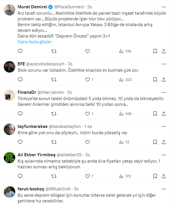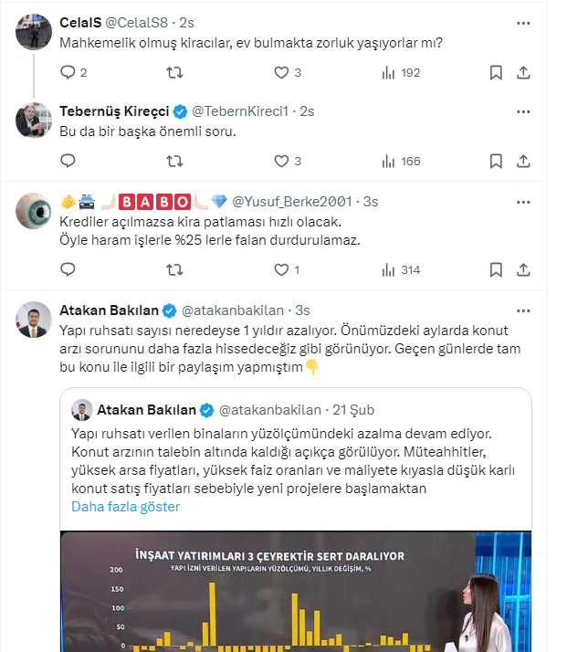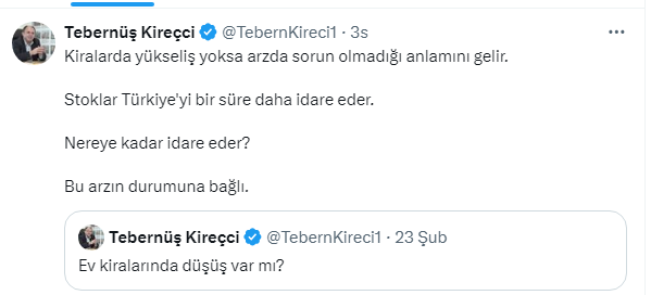 Geçtiğimiz günlerde sosyal medya hesabından 'kiralarda düşüş var mı?' sorusunun üzerine takipçilerin çoğundan kiralarda düşüş olduğuna dair cevaplar alan Kireçci, ''Kiralarda yükseliş yoksa arzda sorun olmadığı anlamına gelir.'' ifadesini kullandı.