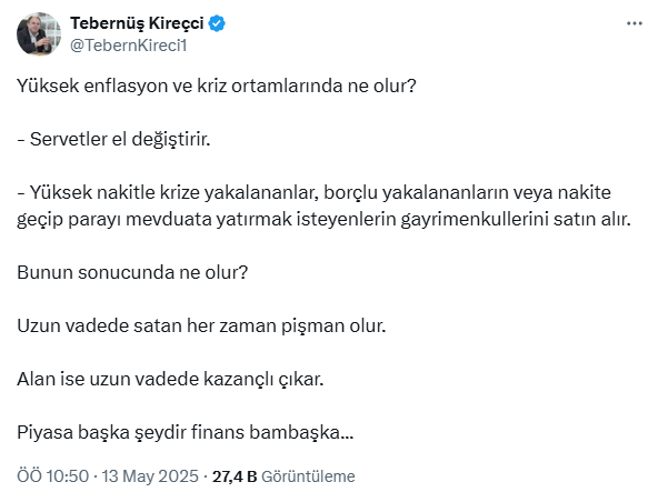 Türkiye'nin 1 numaralı emlak ve konut editörü Tebernüş Kireçci sosyal medya hesabından, yüksek enflasyon ve kriz ortamlarında kimin karlı, kimlerin ise zararlı çıkacağını açıkladı.