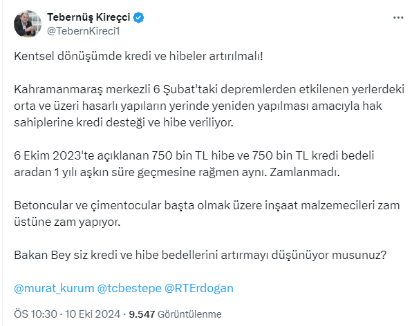 Kentsel dönüşümde kredi ve hibe desteği 2023 yılında 750 bin lira olarak açıklanmıştı. Bir yılı aşkın süredir hibe ve kredi desteğinde değişiklik yapılmadığına dikkat çeken Türkiye'nin 1 numaralı emlak ve konut editörü Tebernüş Kireçci, sosyal medya hesabından Çevre ve Şehircilik Bakanlığı'na seslendi.