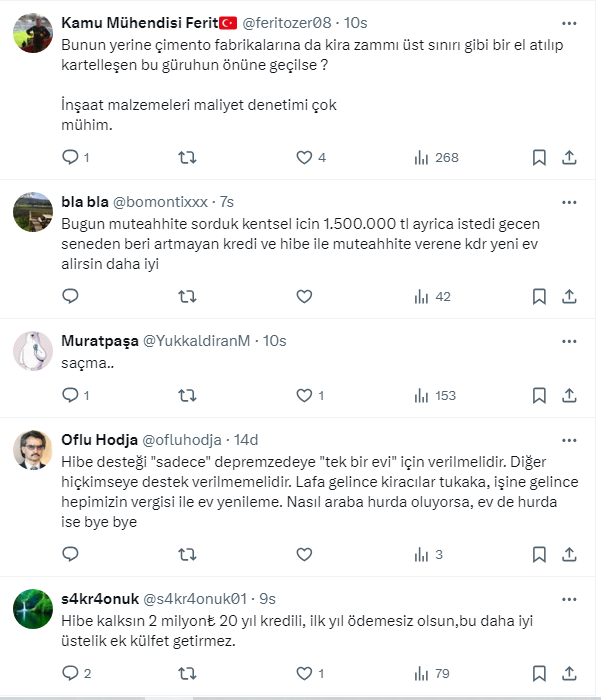 Kireçci, inşaat malzemelerindeki fiyat artışlarına özellikle de beton ve çimentadaki artışlara dikkat çekerek ''Bakan Bey siz kredi ve hibe bedellerini artırmayı düşünüyor musunuz?'' diye sordu. İşte Kireçcii'nin sosyal medya hesabı X'ten yaptığı o paylaşım ve gelen yorumlar...