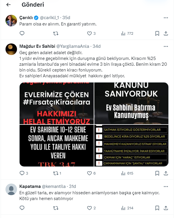 Milyonlarca kişi yatırım için en güvenli liman olarak, konutu tercih ediyor. Son zamanlarda konut fiyatlarındaki fahiş artış ve krediye ulaşmanın imkansız olması, konuta talebi azalttı. Konut yatırımından uzaklaşan vatandaşlar; altın, dolar ve hisse gibi yatırım araçlarını tercih ediyor. Türkiye'nin 1 numaralı emlak ve konut editörü Tebernüş Kireçci, sosyal medya hesabı X'ten konut fiyatlarının diğer yatırım araçları ile arasındaki ilişkiden bahsederek, konut yatırımını diğer yatırımlardan farklı olduğunu örneklerle açıkladı. İşte o paylaşım ve vatandaşlardan gelen yorumlar....