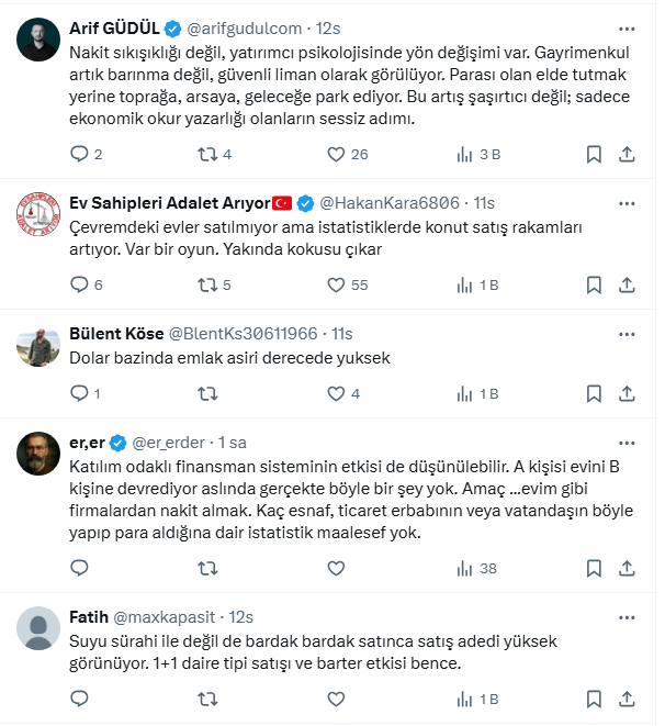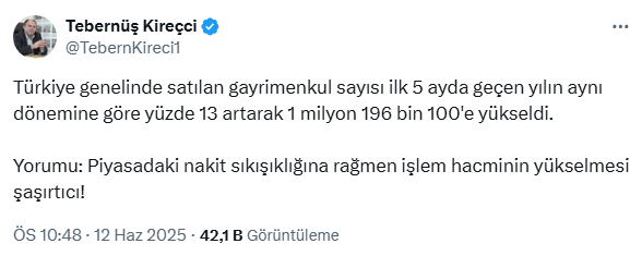 Türkiye'nin 1 numaralı emlak ve konut editörü Tebernüş Kireçci resmi X hesabı üzerinden gayrimenkul satışlarını değerlendirdi.
