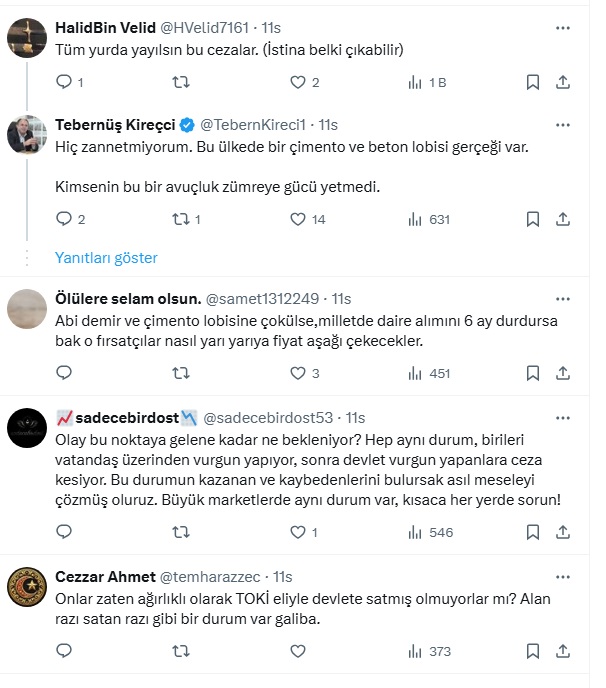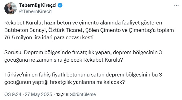 Bunların Türkiye'nin en fahiş fiyatlı betonunu satanlar olduğunu belirten Kireçci Rekabet Kurulu'na ''yaptığı fırsatçılık yanlarına mı kalacak?'' diye sordu. İşte Tebernüş Kireçci'nin sosyal medya hesabı X'ten yaptığı o paylaşım ve gelen yorumlar...