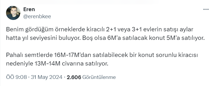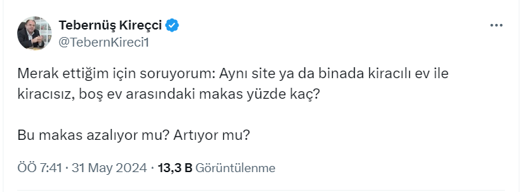 Türkiye'nin 1 numaralı emlak ve konut editörü Tebernüş Kireçci resmi X hesabı https://x.com/TebernKireci1 üzerinden "Aynı site ya da binada kiracılı ev ile kiracısız, boş ev arasındaki makas yüzde kaç?" diye sordu.