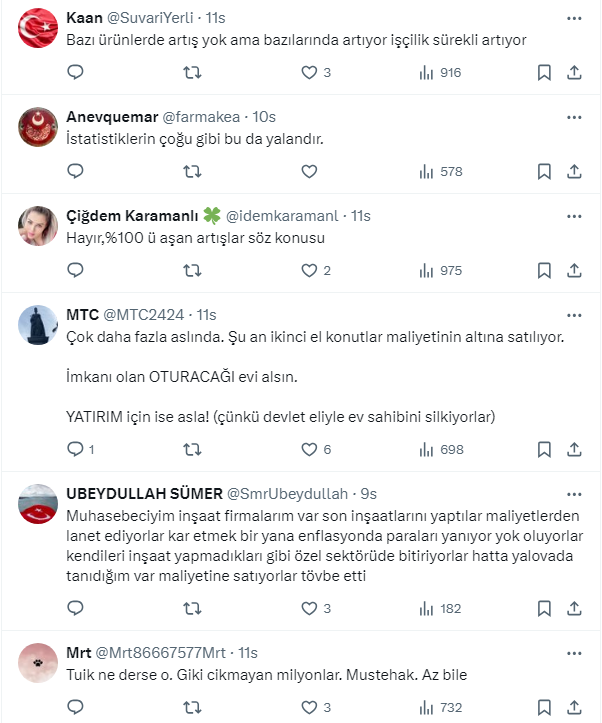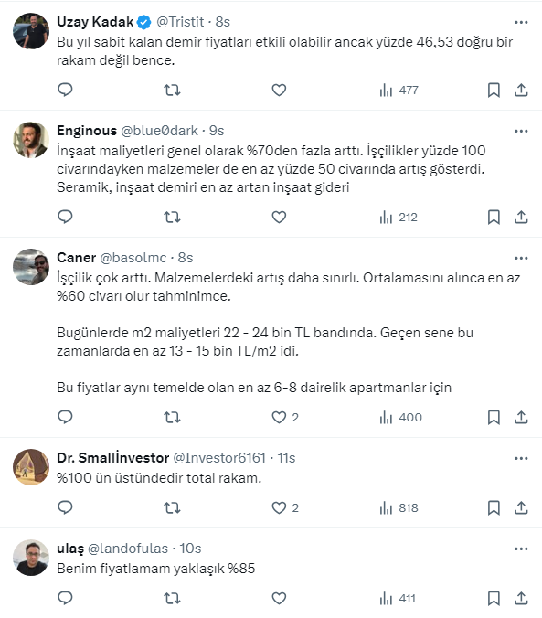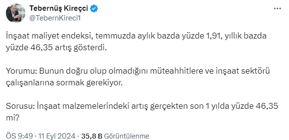 Türkiye'nin 1 numaralı emlak ve konut editörü Tebernüş Kireçci inşaat maliyet endeksi verilerini sosyal meyda hesabından değerlendirdi. Kireçci verilerle ilgili '' Bunun doğru olup olmadığını müteahhitlere ve inşaat sektörü çalışanlarına sormak gerekiyor.'' diyerek 'İnşaat malzemelerindeki artış gerçekten son 1 yılda yüzde 46,35 mi?' sorusunu sordu.