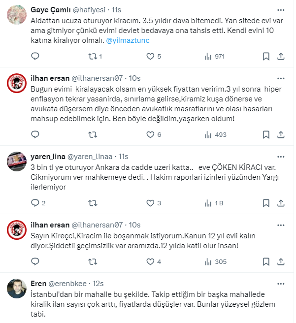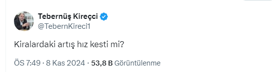 Ülke genelinde özellikle de büyük şehirlerde kiralar fahiş rakamlara ulaştı. Ev alamayan vatandaş şimdi de kira ödemekte zorlanıyor. Türkiye'nin 1 numaralı emlak ve konut editörü Tebernüş Kireçci, sosyal medya hesabından kiracılara seslenerek 'kiralardaki artış hız kesti mi?' sorusunu sordu.
