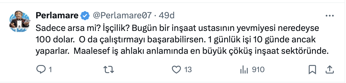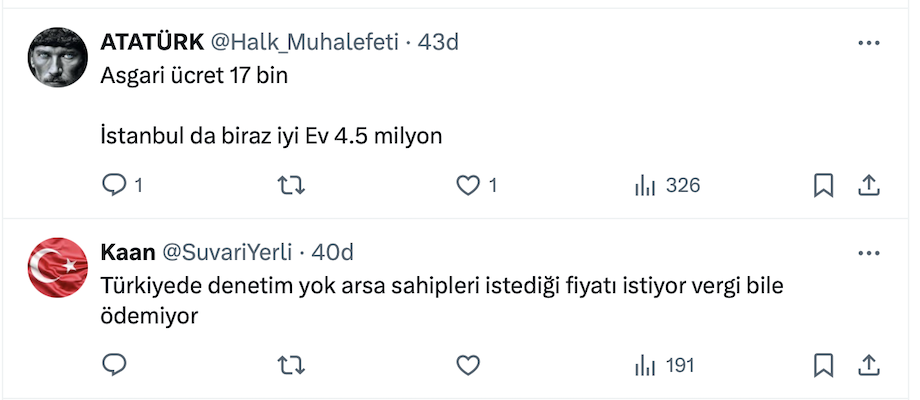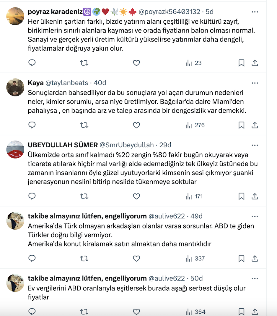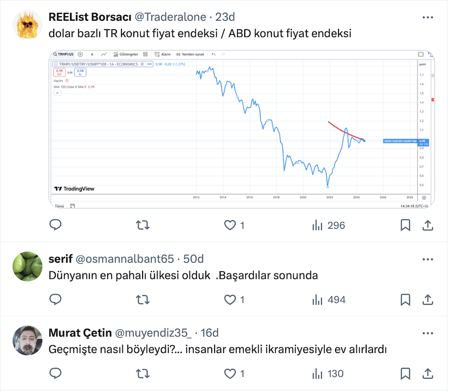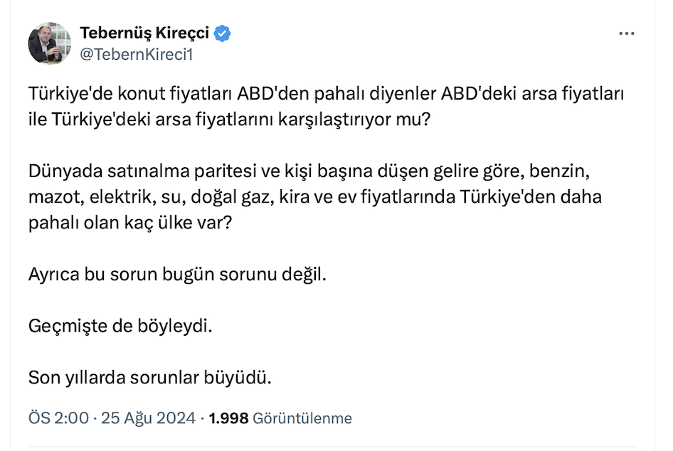 Tebernüş Kireçci resmi X hesabı https://x.com/TebernKireci1 üzerinden yaptığı paylaşımda “Türkiye'de konut fiyatları ABD'den pahalı diyenler ABD'deki arsa fiyatları ile Türkiye'deki arsa fiyatlarını karşılaştırıyor mu?” diye sordu.