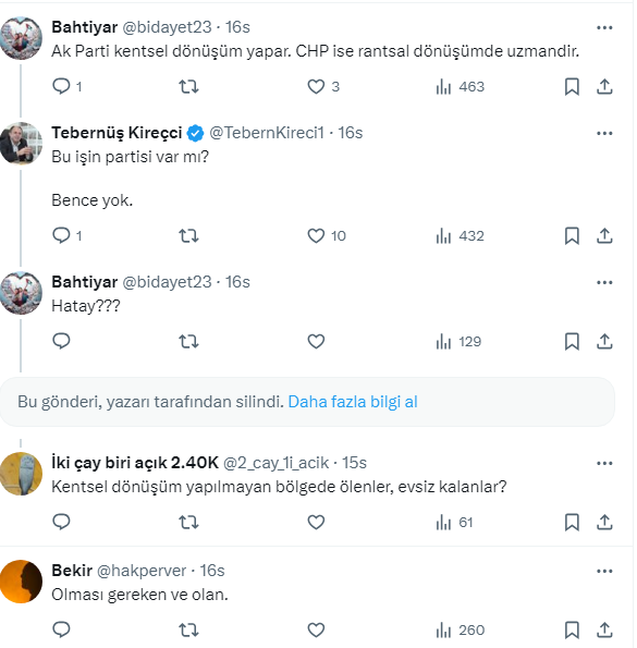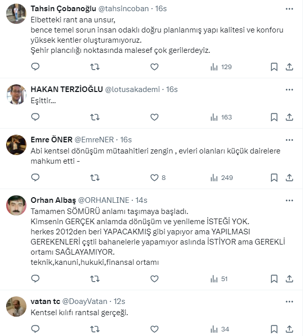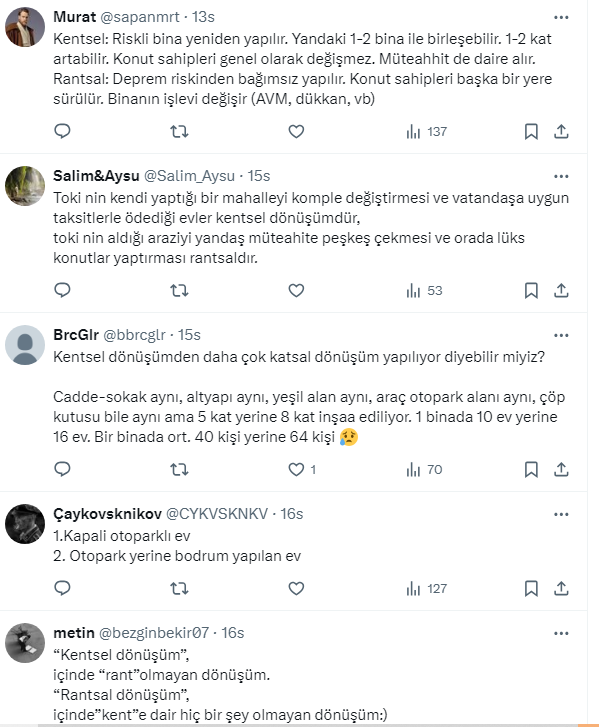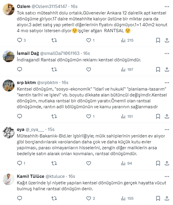 Kentsel dönüşüm alanında en büyük yenilik kentsel dönüşüm yasası oldu. Kentsel dönüşüm yasasıyla birlikte yeni bir dönem başladı. Kentsel dönüşüme yönelik düzenlemeler içeren "Afet Riski Altındaki Alanların Dönüştürülmesi Hakkında Kanun ile Bazı Kanunlarda ve 375 sayılı Kanun Hükmünde Kararnamede Değişiklik Yapılmasına Dair Kanun Teklifi, TBMM Genel Kurulunda kabul edildi. Kanunla, 6 Şubat 2023'te meydana gelen Kahramanmaraş merkezli depremler nedeniyle genel hayata etkili afet bölgesi olarak kabul edilen yerlerde, bu depremlerin ve akabinde meydana gelen depremlerin etkisiyle oluşan hasarlarla bağlantılı olması kaydıyla, hak sahipliğine ilişkin işlemler hariç olmak üzere hasar tespit raporlarına dayalı olarak tesis edilen idari işlemlere karşı açılan iptal davalarında yeni usuller getiriliyor. Düzenlemeyle yargı süreçlerinin hızlandırılması amaçlanıyor. Yeni yasa ile birlikte yeni süreç resmen başlarken ülke genelinde kentsel dönşüm çalışmaları hızla devam ediyor. Bu çalışmalar kapsamında kentsel dönüşüm ile birlikte zaman zaman rantsal dönüşüm de gündeme geliyor. peki kentsel dönüşüm ile rantsal dönüşüm ne demek? Türkiye'nin 1 numaralı emlak ve konut editörü Tebernüş Kireçci, kendi Twitter hesabı üzerinden takipçilerine 'kentsel dönüşüm nedir, rantsal dönüşüm nedir?'' sorusunu sordu. Bakın vatandaşlar ne cevap verdi...