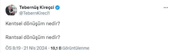 Ülke genelinde kentsel dönüşüm çalışmaları devam ediyor. Özellikle büyükşehirlerde kentsel dönüşüm hızla ilerlerken, Türkiye'nin 1 numaralı emlak ve konut editörü Tebernüş Kireçci, kendi Twitter hesabı üzerinden takipçilerine 'kentsel dönüşüm nedir, rantsal dönüşüm nedir?'' sorusunu sordu. Bakın vat