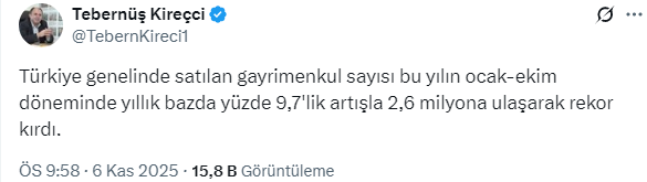 Türkiye'nin 1 numaralı emlak ve konut editörü Tebernüş Kireçci sosyal medya hesabından Türkiye genelinde satılan gayrimenkul sayısının ocak-ekim döneminde yıllık bazda yüzde 9,7'lik artışla 2,6 milyona ulaştığını söyledi.
