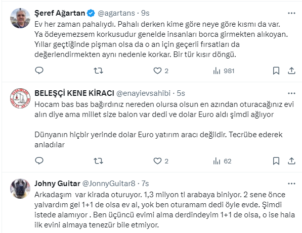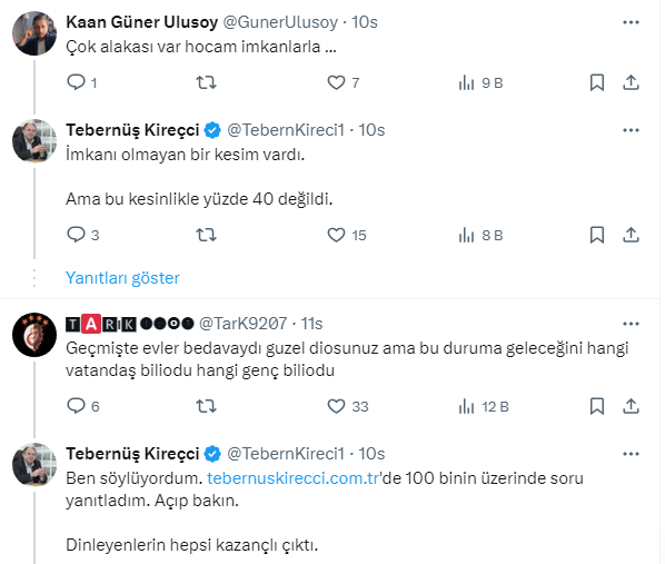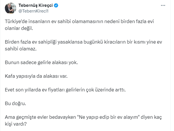Kireçci'ye göre Türkiye'de insanların ev sahibi olamamasının nedeni birden fazla evi olanlar değil. Kireçci, ev fiyatların son zamanlarda arttığını söyleyerek şu noktaya değindi evler bedavayken "Ne yapıp edip bir ev alayım" diyen kaç kişi vardı?'' diye sordu.