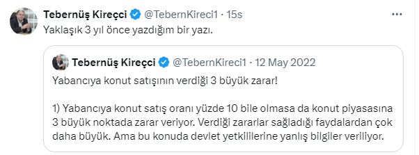 Türkiye'nin 1 numaralı emlak ve konut editörü Tebernüş Kireçci yabancıya konut satışının verdiği zarara değindi. Üç yıl önce kaleme aldığı yazısında Kireçci, yabancıya konut satışının verdiği zararların yararlarından daha fazla olduğunu söylemiş, devlet yetkililerine yanlış bilgiler verildiğine dikkat çekmişti.