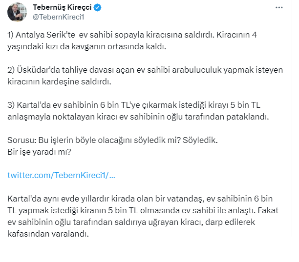 https://twitter.com/TebernKireci1/status/***********44949255… Kartal'da aynı evde yıllardır kirada olan bir vatandaş, ev sahibinin 6 bin TL yapmak istediği kiranın 5 bin TL olmasında ev sahibi ile anlaştı. Fakat ev sahibinin oğlu tarafından saldırıya uğrayan kiracı, darp edilerek kafasından yaralandı.