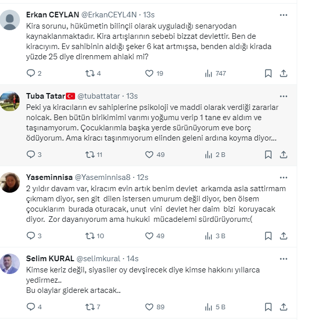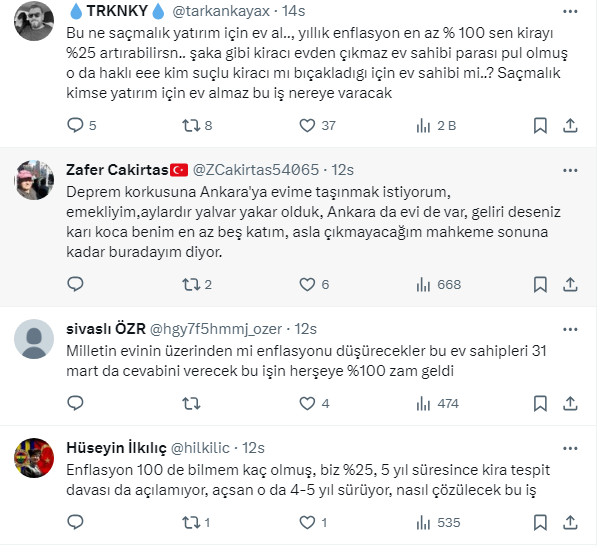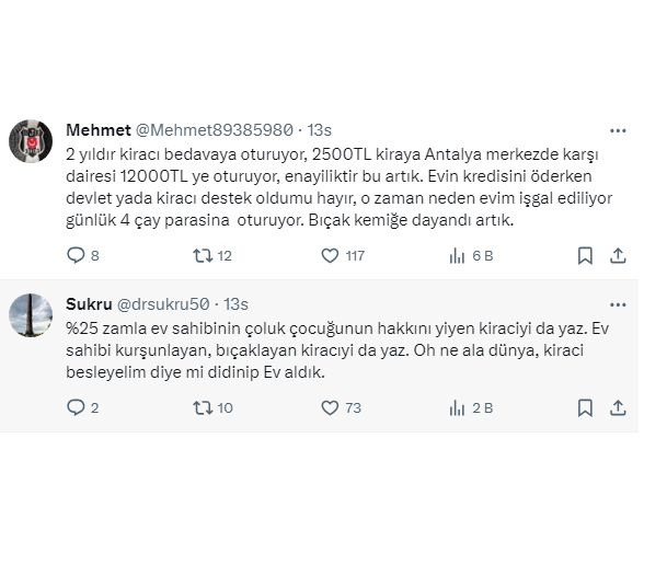 Mehmet @Mehmet89385980: ''2 yıldır kiracı bedavaya oturuyor, 2500TL kiraya Antalya merkezde karşı dairesi 12000TL ye oturuyor, enayiliktir bu artık. Evin kredisini öderken devlet yada kiracı destek oldumu hayır, o zaman neden evim işgal ediliyor günlük 4 çay parasina oturuyor. Bıçak kemiğe dayandı artık.'' diyerek isyan etti.