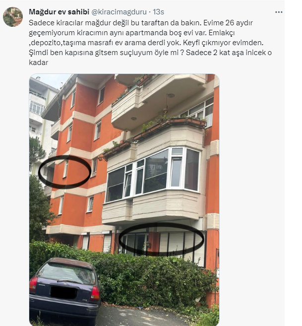 Mağdur ev sahibi @kiracimagduru: ''Sadece kiracılar mağdur değil bu taraftan da bakın. Evime 26 aydır geçemiyorum kiracımın aynı apartmanda boş evi var. Emlakçı ,depozito,taşıma masrafı ev arama derdi yok. Keyfi çıkmıyor evimden. Şimdi ben kapısına gitsem suçluyum öyle mi ? Sadece 2 kat aşa inicek o kadar.'' dedi.