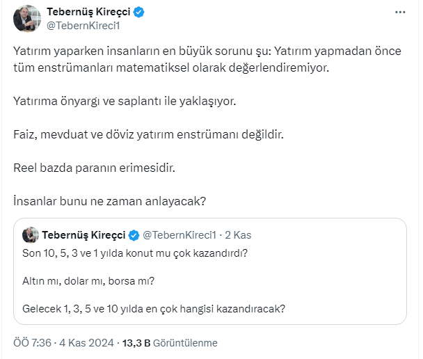 Kireçci, sosyal medya hesabından, Yatırım yaparken insanların en büyük sorununun, yatırım yapmadan önce tüm enstrümanları matematiksel olarak değerlendirmemeleri olarak açıkladı.
