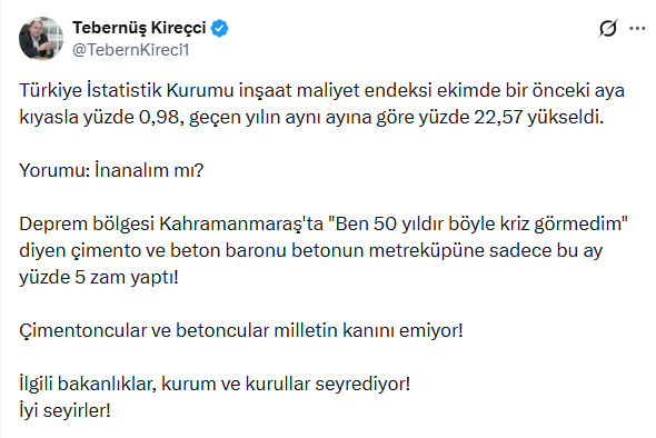 Türkiye İstatistik Kurumu tarafından açıklanan inşaat maliyet endeksi ekim verilerini değerlendiren Türkiye'nin 1 numaralı emlak ve konut editörü Tebernüş Kireçci, sosyal medya hesabından inşaat sektörüne dair çarpıcı açıklamalarda bulundu.