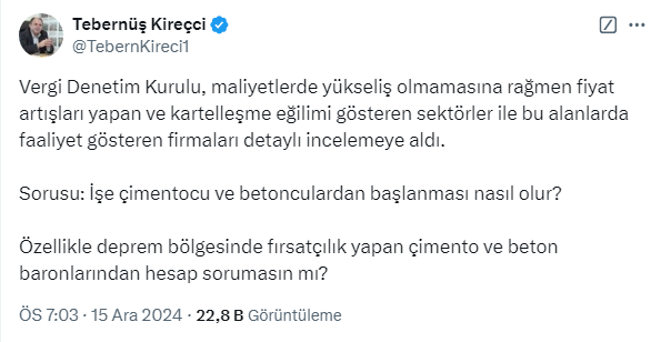 Tebernüş Kireçci'den Vergi Denetim Kurulu'na denetim çağrısı: İşe çimentocu ve betonculardan başlanması nasıl olur?