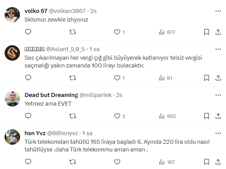 Vergi Uzmanı Ozan Bingöl resmi X hesabı https://twitter.com/ozanbingoll/ üzerinden GSM hattı sahiplerinden her ay tahsil edilen “Telsiz Kullanım Ücreti”nin beş yıllık artışını paylaştı. Ozan Bingöl'ün paylaşımına göre "2020: Aylık 2,85TŞ, 2024: Aylık 14,94 TL, sadece beş yıldaki artış oranı yüzde 425."