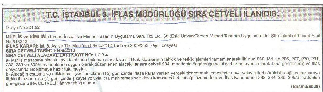 Eğitim Temart İnşaat resmen iflas etti! 17 Ağustos 2010, Salı İflasına karar verilen Temart İnşaat ve Mimari Tasarım Uygulama San. Tic. Ltd. Şti.'nin, İstanbul 3. İflas Müdürlüğü sıra cetveli ilanı... T.C. İstanbul 3. İflas Müdürlüğü Sıra Cetveli İlanıdır.Ayrıntılı bilgi için tıklayınız Twitter Facebook instagram pinterest İlginizi Çekebilir Fed altının parıltısını aldı! Resmen tepetaklak etti! Altın yatırımcıları yas tutuyor! Herkes bu rakamları konuşuyor Japonya'da son bir yılda 140 inşaat firması iflas etti! Japonya'da son bir yılda 85 inşaat firması iflas etti! Modern Oryantal Halı Tekstil İnşaat şirketinin iflas ilanı! Hamle Beton resmen iflas etti! Doğa İnşaat resmen iflas etti! Çelikler İnşaat resmen iflas etti! Akataylar İnşaat resmen iflas etti!