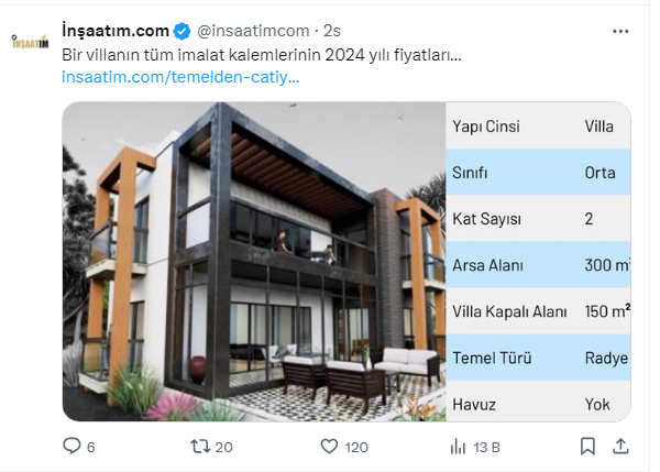 Söz konusu metrekare villa maliyeti, inşaatın yapıldığı yer, kullanılan malzeme ve işçilik kalitesi ile proje detaylarına göre farklılık gösterebilir.