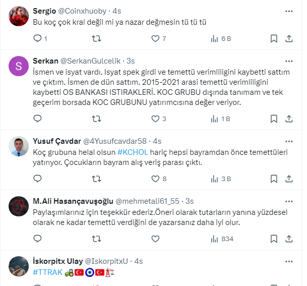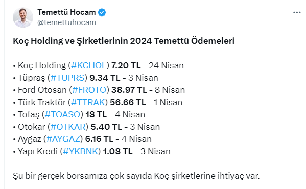Temettü Hocam, https://twitter.com/temettuhocam X sosyal medya hesabından yaptığı paylaşımda, Koç Holding ve şirketlerinin 2024 temettü ödeme tarihleri ve miktarlarını paylaşarak, “Borsamızda çok sayıda Koç Şirketi’ne ihtiyaç var” dedi.