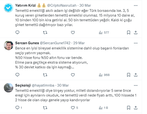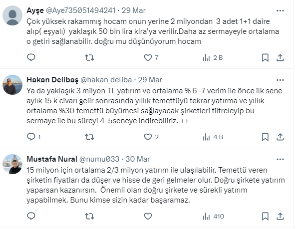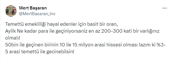 Yatırım Uzmanı Mert Başaran son dönemde sıkça gündeme gelen temettü emeklisi olmak isteyenler için https://twitter.com/MertBasaran_inv X Sosyal medya hesabından bir paylaşım yaptı. Başaran, paylaşımında temettü emekliliği hayal edenler için basit bir oran, aylık ne kadar para ile geçiniyorsanız en az 200-300 katı bir varlığınız olmalı! 50 bin lira ile geçinen birinin 10 ile 15 milyon arası hissesi olması lazım ki yüzde 3-5 arası temettü ile geçinebilsin” dedi.