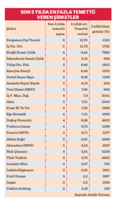 Gedik Yatırım’ın çalışmaları kapsamında son 5 senede ortalama olarak temettü verimi en yüksek hisse yüzde 13.79 ile Pergamon Dış Ticaret. Bu şirketi yüzde 11.78’lik temettü verimi ile İş Yatırım Ortaklığı takip ediyor. Ereğli Demir Çelik de son 5 yılın dördünde temettü dağıttı ve ortalama temettü verimi yüzde 9.44. Ancak Ereğli’nin 2023 yılını zararla kapatması bekleniyor. Tofaş Oto, Enerjisa, Vestel Beyaz, Anadolu Hayat Emeklilik yine temettü verimi yüksek şirketler listesinde üst sıralarda yer alıyor. Temettü verimi yüksek şirketlerin son 5 yıllık hisse performansları da oldukça yüksek. Temettü verimi en yüksek ilk 10 şirket hissesinin 5 yıllık getirileri de yüzde 825 ile yüzde 8 bin arasında değişiyor.