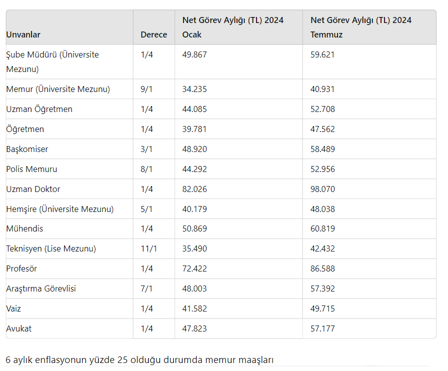 6 aylık enflasyonun yüzde 25 çıkması ve maaş zammının yüzde 19,56 seviyelerinde gerçekleşmesi halinde memur maaşları şu şekilde olacak: