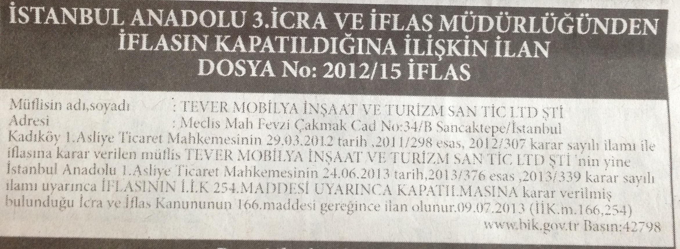 İstanbul Sancaktepe'de bulunan Tever Mobilya İnşaat'ın Kadıköy 1.Asliye Ticaret Mahkemesinin 2012/307 kara sayılı ilanı ile iflasına karar verildi.Karar resmi gazete de açıklandı.