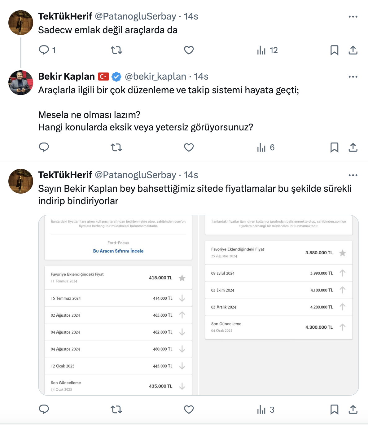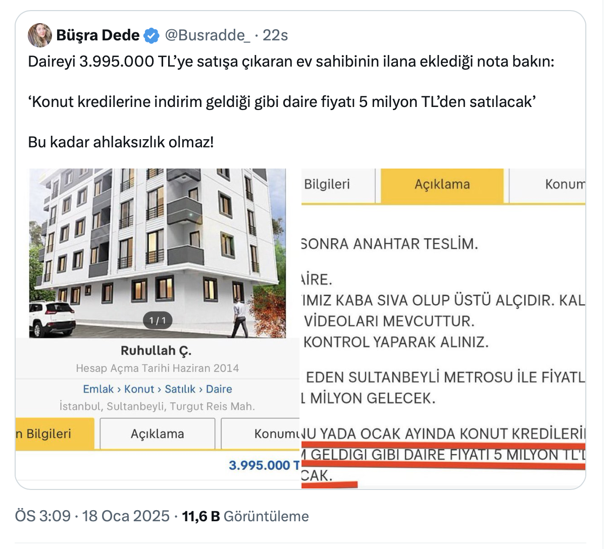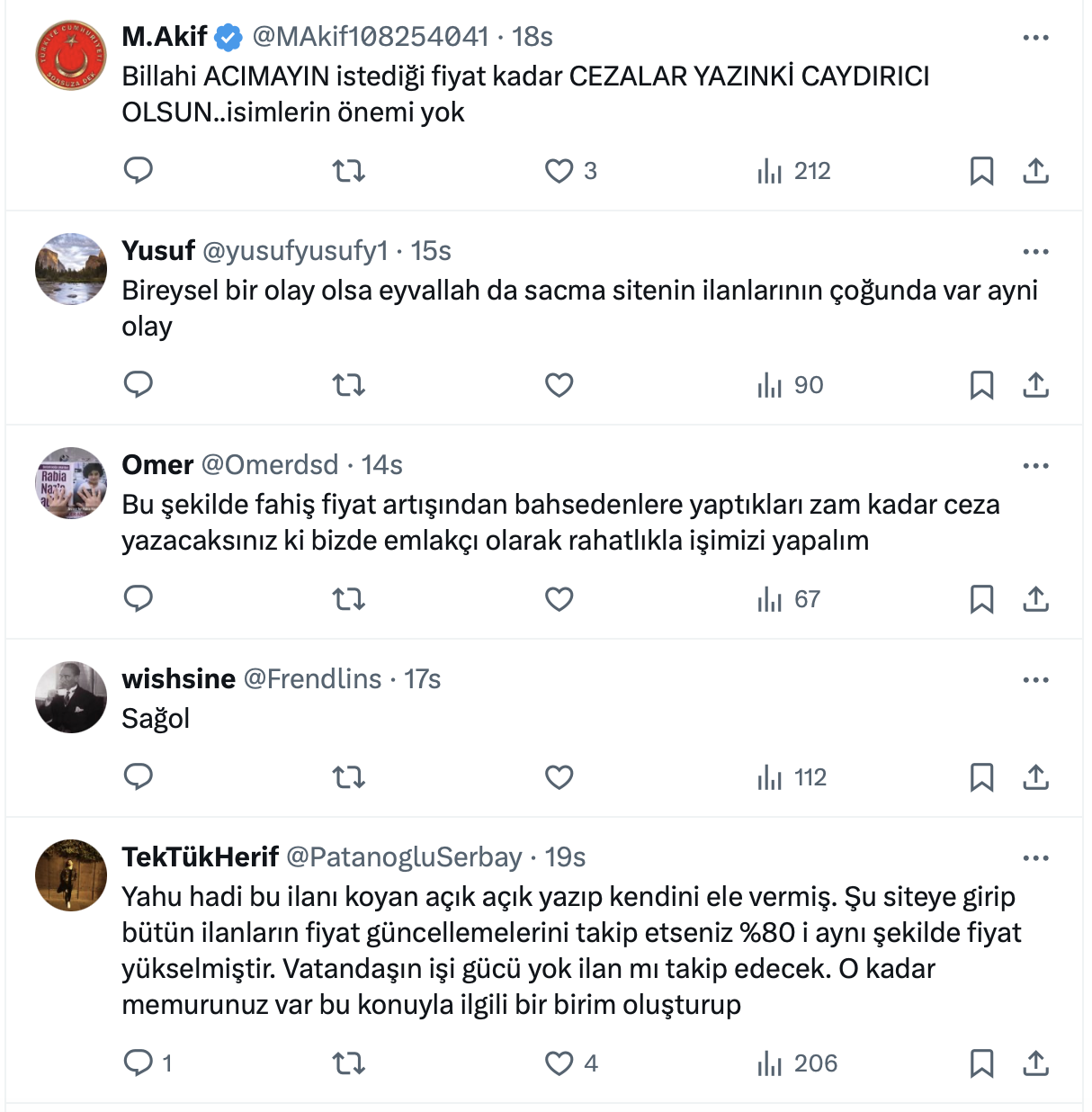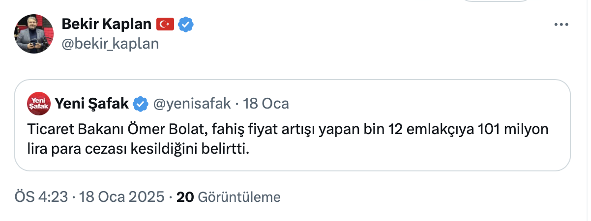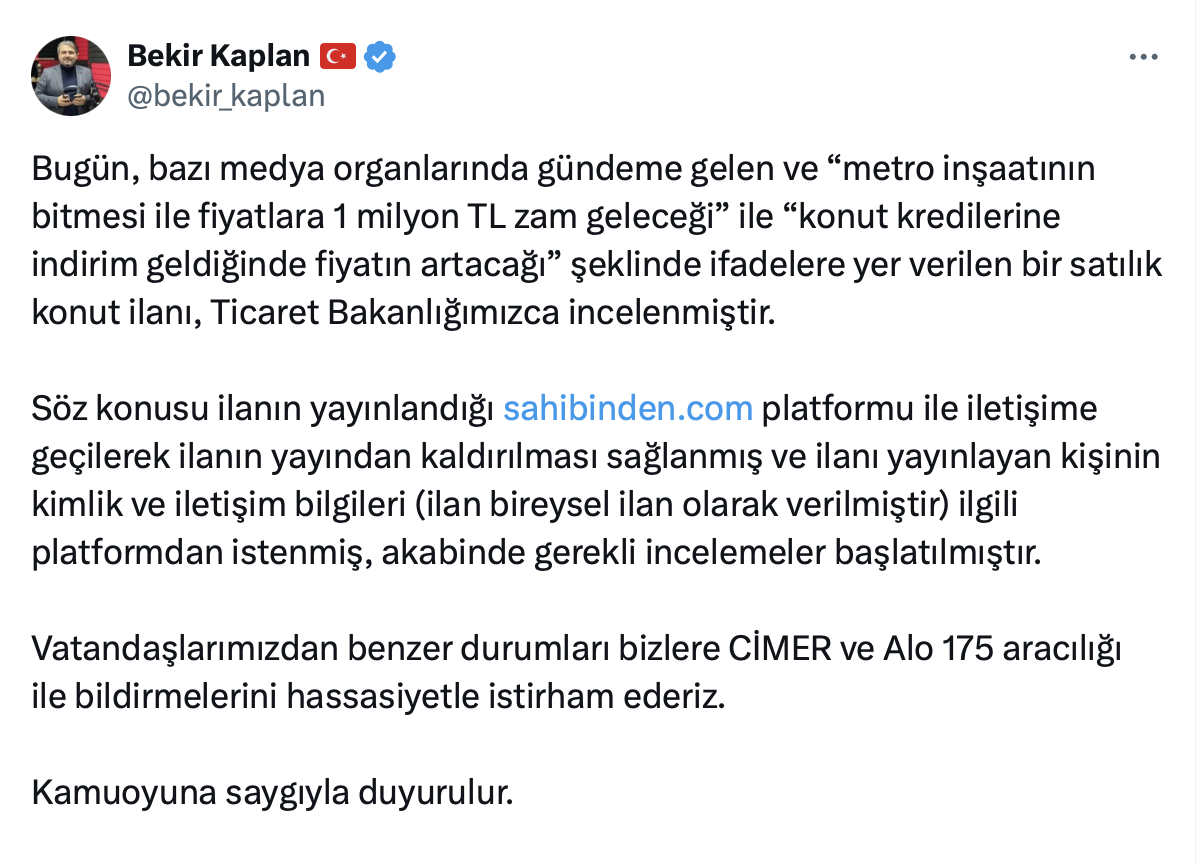 Bekir Kaplan yaptığı paylaşımda: “Bugün, bazı medya organlarında gündeme gelen ve “metro inşaatının bitmesi ile fiyatlara 1 milyon TL zam geleceği” ile “konut kredilerine indirim geldiğinde fiyatın artacağı” şeklinde ifadelere yer verilen bir satılık konut ilanı, Ticaret Bakanlığımızca incelenmiştir.'' İfadelerini kullandı.