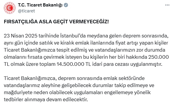 Ticaret Bakanlığımızca, deprem sonrasında emlak sektöründe vatandaşlarımız aleyhine gelişebilecek durumlar takip edilmeye ve mağduriyete neden olabilecek uygulamaları engellemeye yönelik tedbirler alınmaya devam edilecektir."