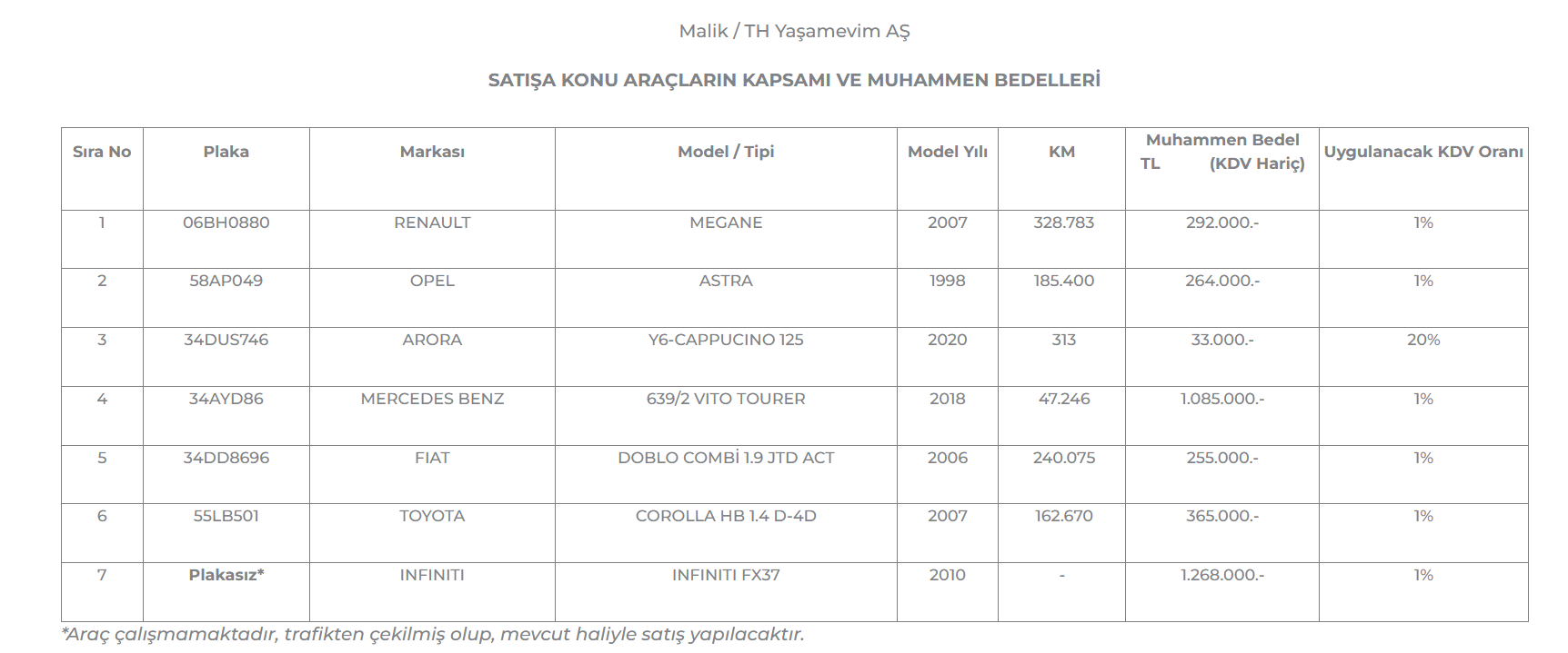 Tasfiye Halinde Yaşamevim Gayrimenkul AŞ’nin (TH Yaşamevim AŞ/Malik) araçları kapalı zarf ve açık artırma usullerinin birlikte uygulanması suretiyle haciz, rehin gibi yasal takyidatlardan ari olarak İhale Şartnamesinde (Şartname) belirtilen kayıt ve şartlarla satışa çıkarılmıştır.