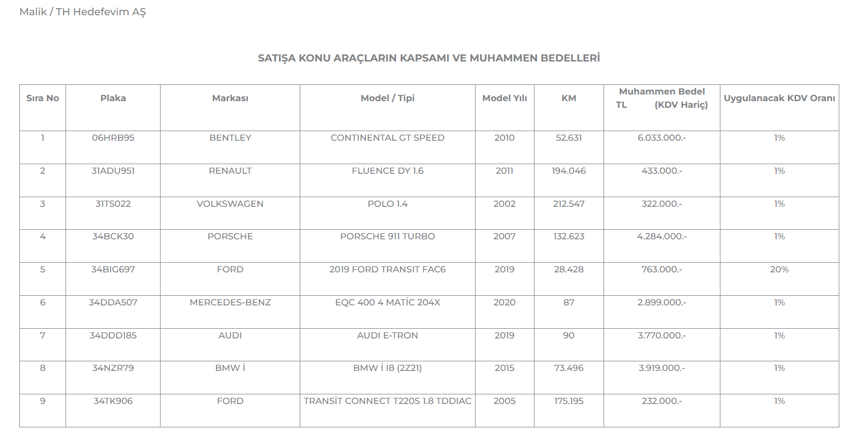 Tasfiye Halinde Hedefevim Gayrimenkul Otomotiv ve Ticaret AŞ’nin (TH Hedefevim AŞ/Malik) araçları kapalı zarf ve açık artırma usullerinin birlikte uygulanması suretiyle haciz, rehin gibi yasal takyidatlardan ari olarak İhale Şartnamesinde (Şartname) belirtilen kayıt ve şartlarla satışa çıkarılmıştır.